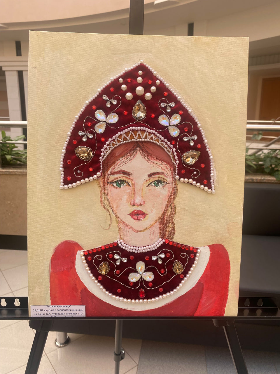 Для выставки к Году единства народов России инженер отобрала две своих работы – картину с элементами вышивки «Русская красавица» и кукол в татарских народных костюмах. Картина «родилась» случайно, в процессе освоения новых материалов – бисера, бусин, камней-кабошонов. Задумывалась брошь а-ля красавица в кокошнике, а тут еще подвернулся кусок бархата шикарного винного цвета. Рукодельница решила сделать кокошник и нагрудник побольше. Тут-то все и оформилось в картину. На посетителей выставки с нее глядит волоокая зеленоглазая краса с русой косой в богато расшитом головном уборе, с поблескивающими камнями на бархатном нагруднике. Глаз не отвести!