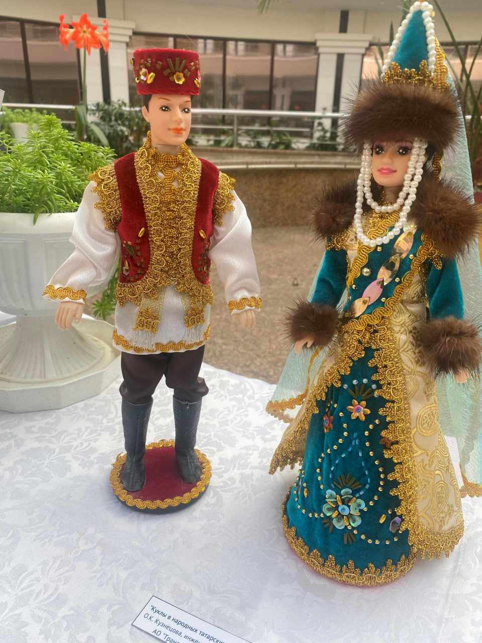 С куклами еще проще – надо было пристроить кусочек меха норки. И появилась идея одеть парня и девушку в нарядные татарские костюмы. Норка, конечно же, досталась татарочке на опушку головного убора, манжет и плеч. Зато парень обулся в мягчайшие кожаные сапожки. Куклы оделись в красный жилет, расшитую тюбетейку и бирюзовое многослойное платье.