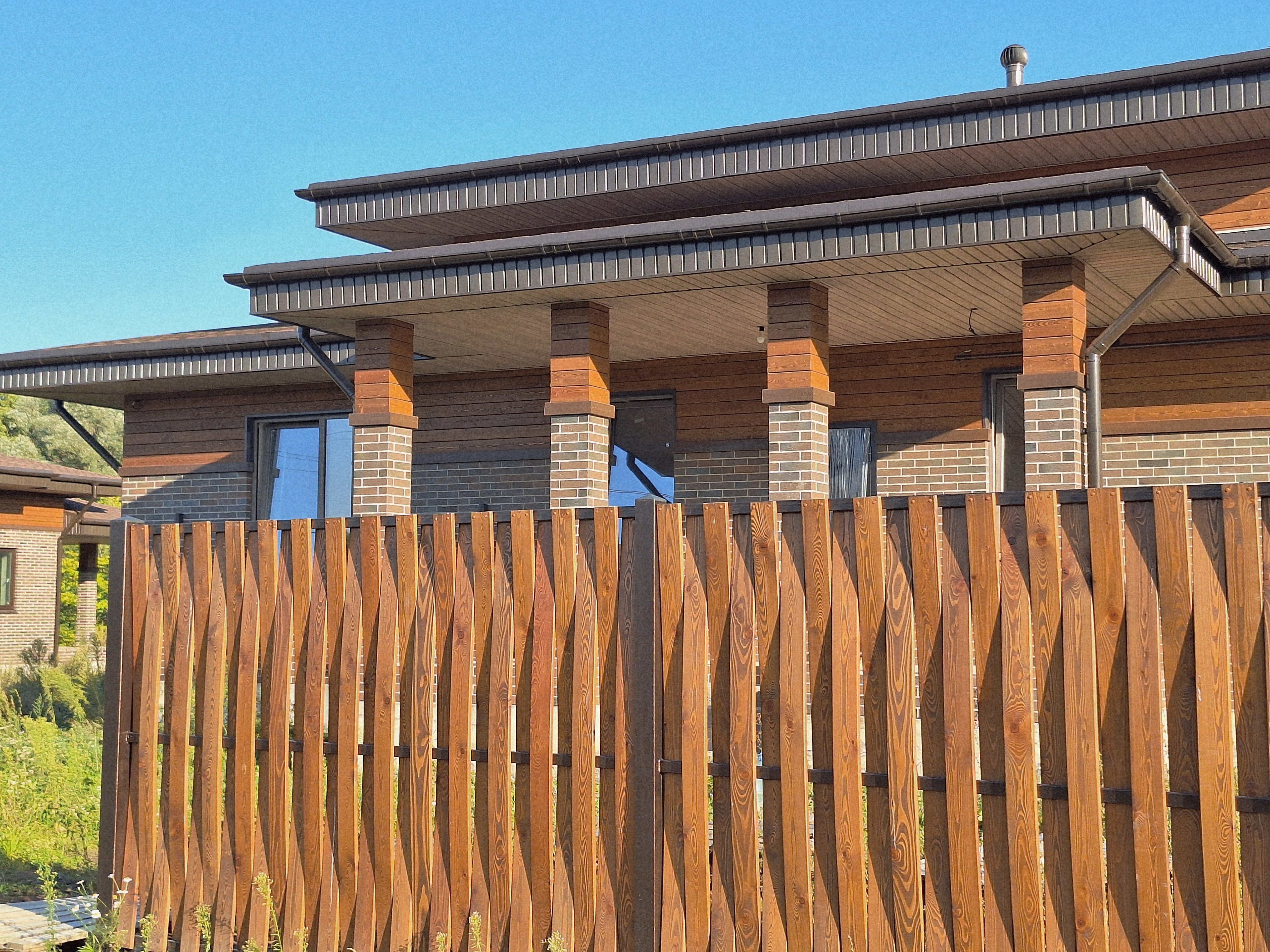 В «Жемчужине» это заметно на практике. Дома здесь не стремятся уместить в один объём. Баню, гараж или хозяйственные блоки выносят отдельно и связывают переходами. В итоге участок перестает быть просто территорией вокруг дома и становится частью общей архитектуры.
