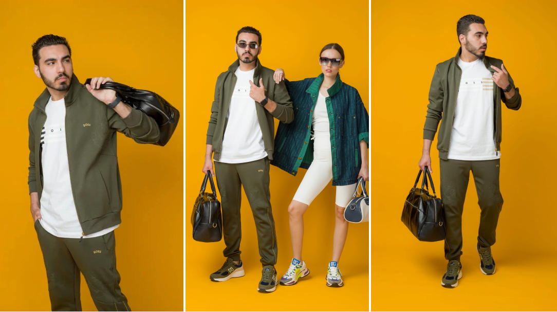 Где купить: павильон №19, 1 этаж и «ЭконоМаркет», 2 этаж. На модели-мужчине: комфортный спортивный костюм с вышивкой и вертикальными полосками на штанах за 15000 рублей, белая футболка за 2500 рублей, кроссовки в тон костюма за 2099 рублей.