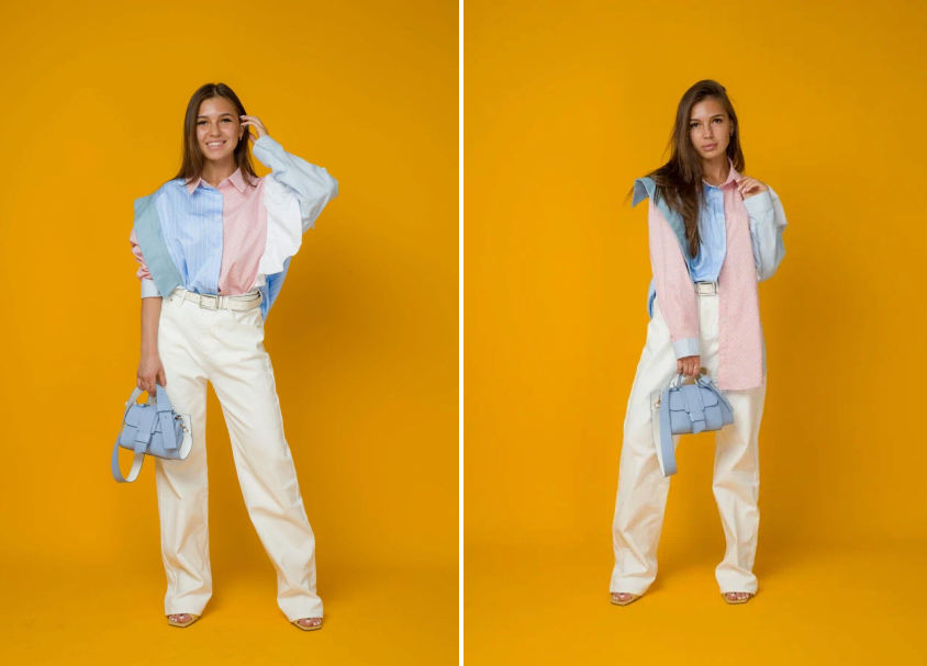 Ассиметричная рубашка с воланами в пастельных тонах гармонично сочетается с белыми брюками. За счёт сдержанных цветов создаётся «зефирный» и женственный образ. Такой вариант – прекрасное решение для похода на свидание, в кино или же на прогулку.
