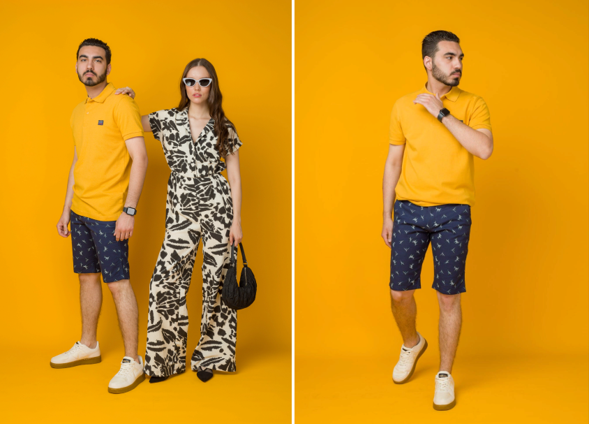 Где купить: ProMax, 2 этаж, павильон №97, 1 этаж и «ЭконоМаркет», 2 этаж. На модели-мужчине: синие шорты с принтом за 2500 рублей, желтая футболка-поло за 2000 рублей и универсальные белые кеды за 1590 рублей.
