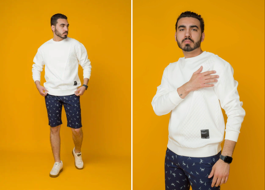 Где купить: ProMax и «ЭконоМаркет» на 2 этаже. На модели: белая толстовка с рельефными деталями и синие шорты с принтом. Верх стоит 3100 рублей, а низ – 2500 рублей. Белые кеды вы сможете купить за 1590 рублей.