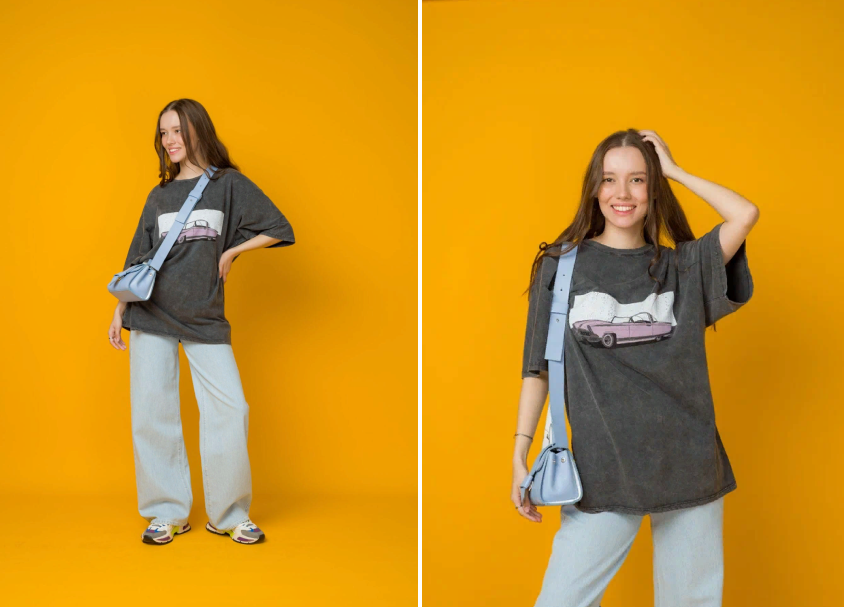 Где купить: Op&Shop, 1 этаж и Bolero, 2 этаж. На модели: футболка-оверсайз серого цвета с принтом розового кабриолета за 1950 рублей, голубая сумка через плечо за 6500 рублей, яркие кроссовки за 9000 рублей и прямые голубые джинсы за 3900 рублей.