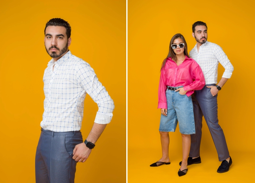 Где купить: Popolare, 1 этаж и «ЭконоМаркет», 2 этаж. На модели-мужчине: классические брюки за 3500 рублей, белая приталенная рубашка в клетку за 399 рублей и обувь за 1699 рублей.