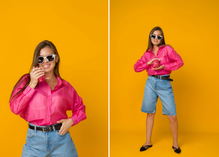 Где купить: Op&Shop и «Сливки» на 1 этаже. На модели: яркая розовая рубашка-оверсайз стоимостью 3800 рублей, прямые джинсовые шорты за 2200 рублей, черные мюли за 4200 рублей и солнечные очки за 650 рублей.