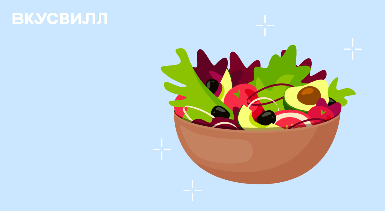 Соберите набор для лёгких и полезных блюд из продуктов ВкусВилла — всё нужное доставят за 1–2 часа совершенно бесплатно, независимо от суммы заказа.