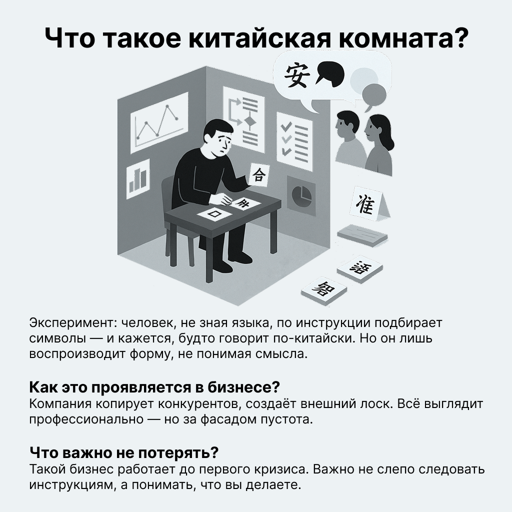— Станислав, как вы интерпретируете эксперимент «Китайская комната» в предпринимательской практике?
