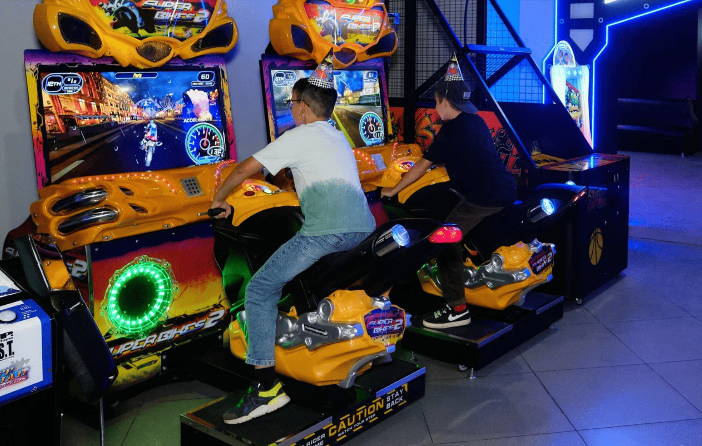 Затем программа снова набирает скорость. Подключаются дополнительные активности — игровые автоматы, VR симуляторы, приставки. Формат становится более свободным, дети сами выбирают, чем заняться, но при этом остаются внутри общего пространства праздника.