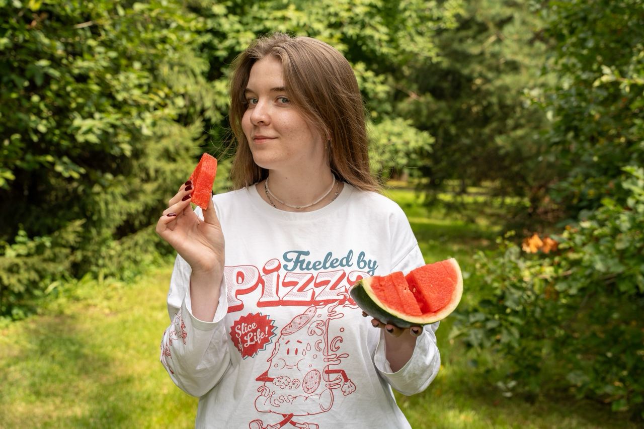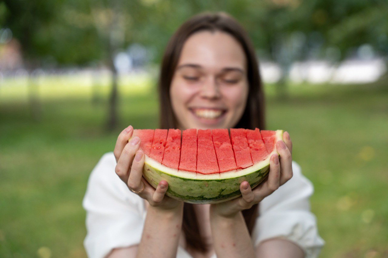 Анна выбрала арбуз «Максим» — красный, сочный и абсолютно без семен. Первый кусок — и сразу понятно: сладости хватит на всех, а хрустящая мякоть освежает лучше любого лимонада. Для Анны этот арбуз оказался особенно удобным открытием: носить брекеты и при этом спокойно наслаждаться арбузом без косточек — редкое удовольствие.