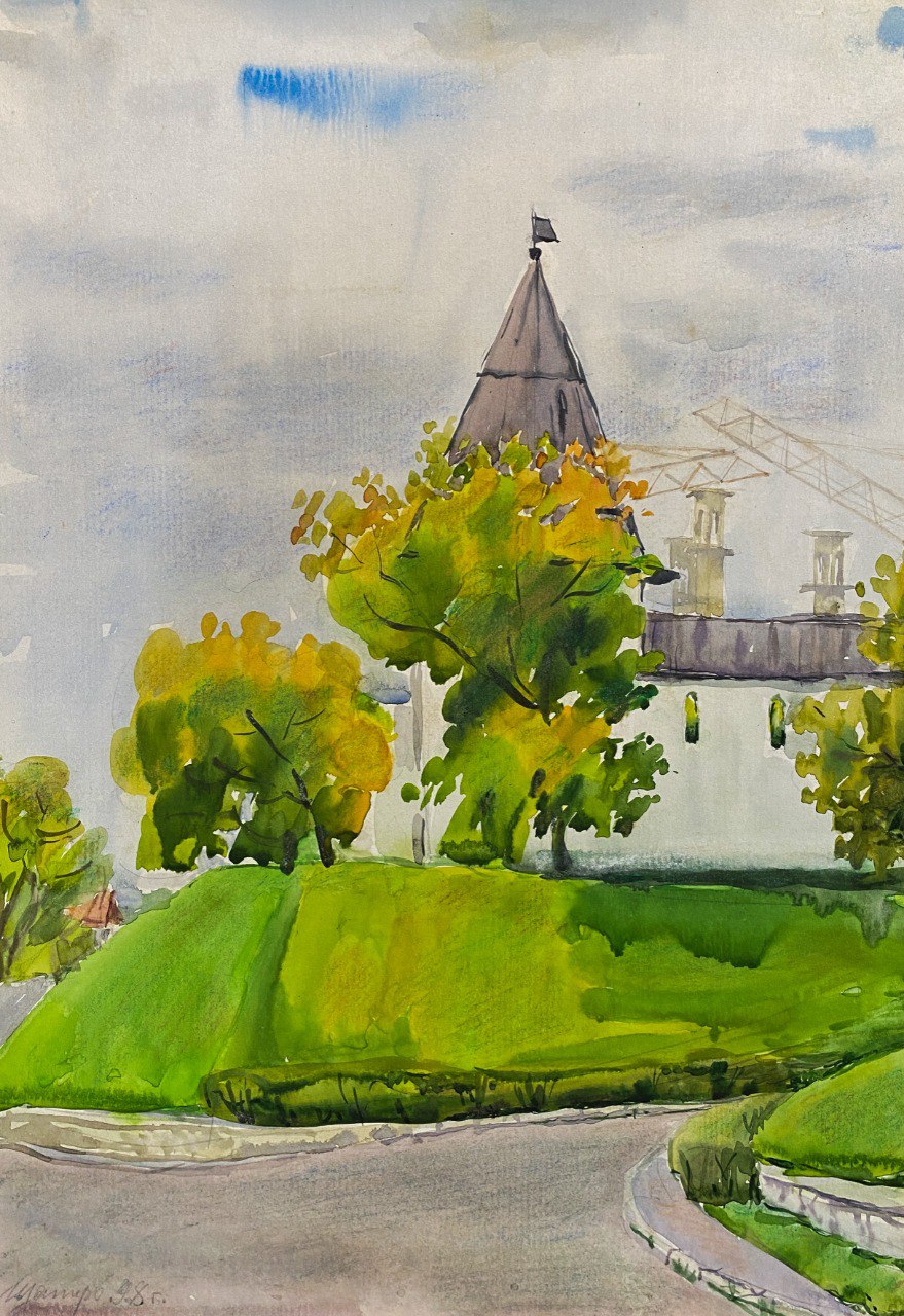 Там, где сейчас широкие магистрали, у Шапиро — узкие тротуары. Там, где выросли современные комплексы, ещё стоят деревянные дома с резными ставнями. В работах конца девяностых можно заметить и важный для города маркер — строительство мечети Кул Шариф, начатое в 1996 году. Это знак времени, которое начинает менять облик города.