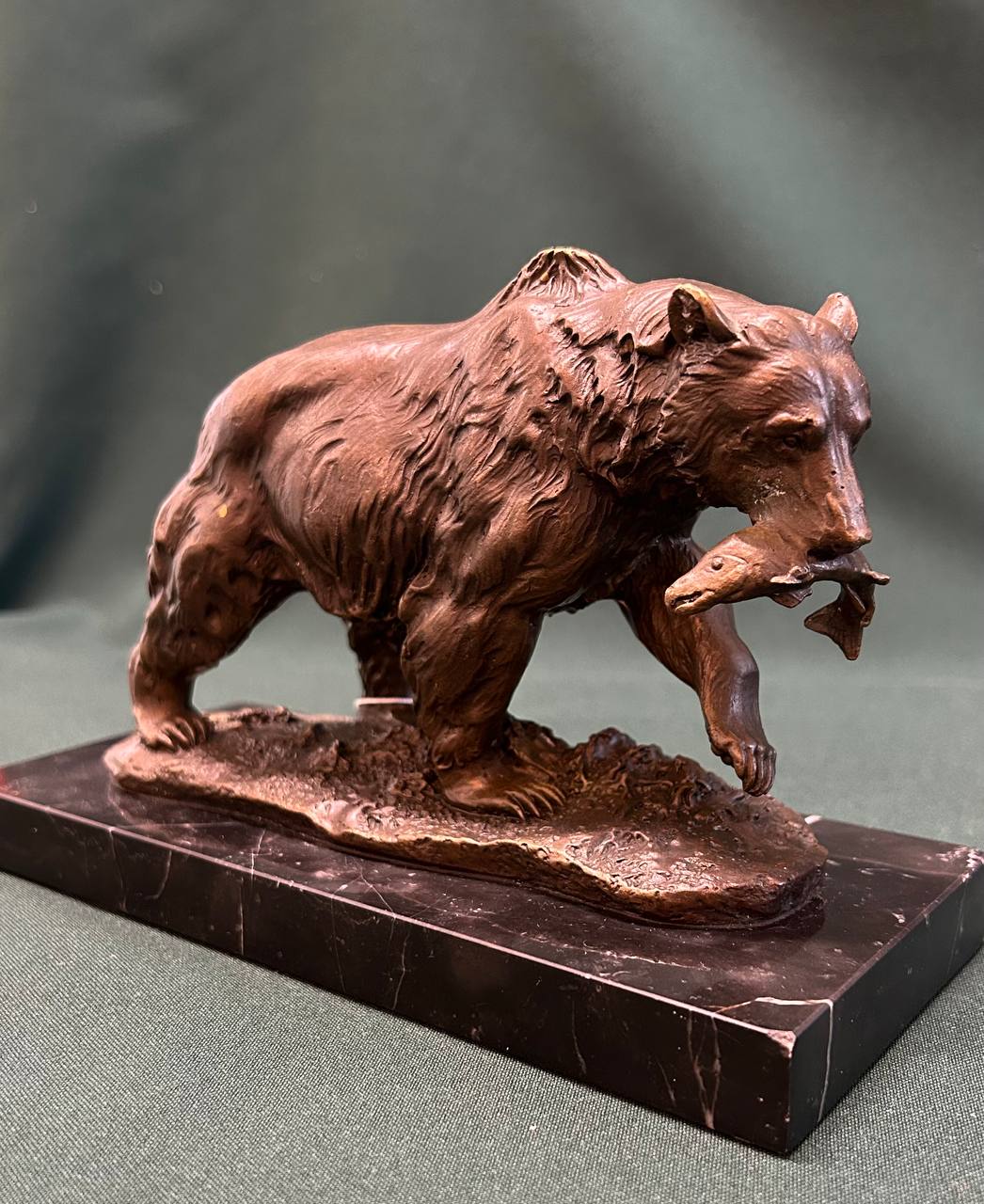 Декоративная скульптура медведя из бронзы и чугуна на мраморном основании. Композиция выполнена с высокой детализацией и передаёт мощь и пластичность зверя, что делает её выразительным акцентом в интерьере. Такой предмет идеально подходит для кабинета или гостиной и символизирует силу и уверенность.