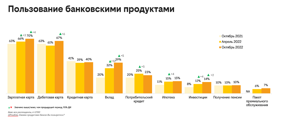 В рамках инициативного исследования «Банковский мониторинг» респондентов спросили об использовании финансовых продуктов в настоящее время, а также о намерении начать или завершить пользование в ближайшие полгода, до марта 2023 года.