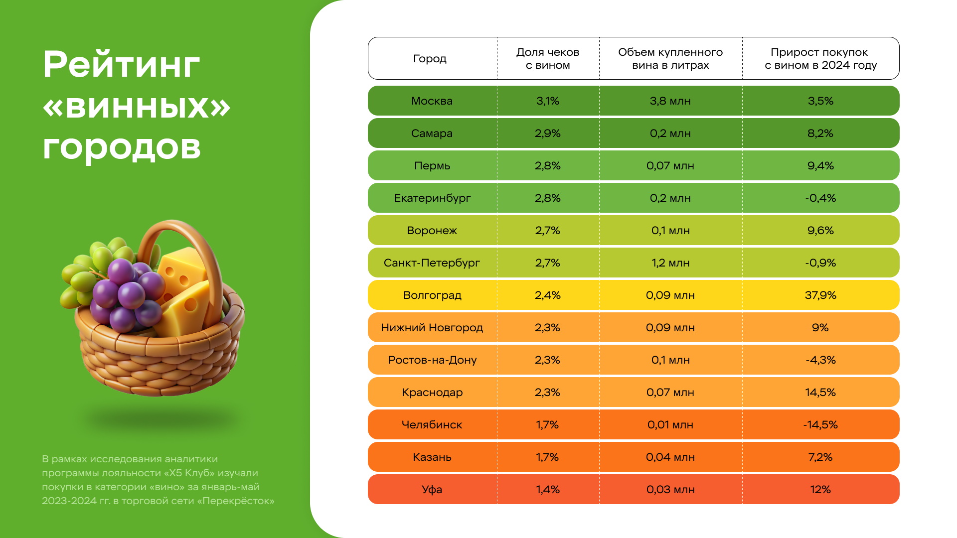 Вино встречается в чеках жителей Казани в 1,7% случаев. В 2024 году (январь-май) жители города покупали вина больше на 7,2% год к году — это 40 тыс. литров приобретенного вина, что в 3 раза больше, чем в Челябинске, с которым Казань разделила свое место. Доля чеков премиум-вин (стоимость вина более 2000 руб) составила 0,6% от всех чеков с вином. Наибольшим спросом пользуются белые сухие и полусладкие вина, красные полусладкие стоят на третьем месте по спросу, а наименее популярное вино — розовое сладкое.