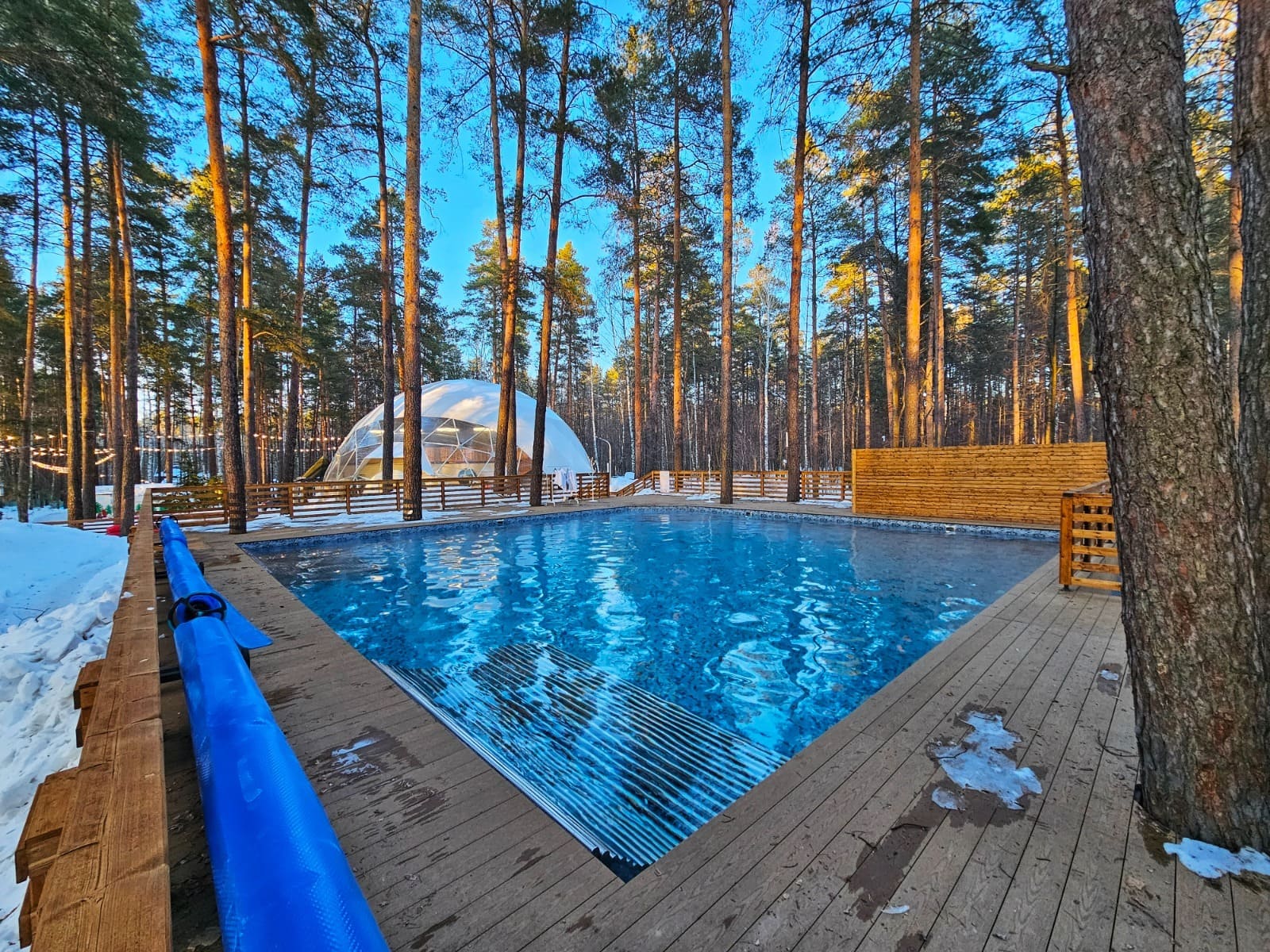 Глэмпинг предлагает 10 домов в стиле «A-frame». В каждом — тёплая атмосфера, удобная мебель и собственная терраса для отдыха. Гостей также ждёт трёхэтажный отель с сауной и бассейном, где можно полностью расслабиться и насладиться природой, не жертвуя комфортом. Внутри предусмотрены бассейны, создающие идеальные условия для расслабления. Здесь можно ощутить полное единение с природой, не отказываясь от уюта