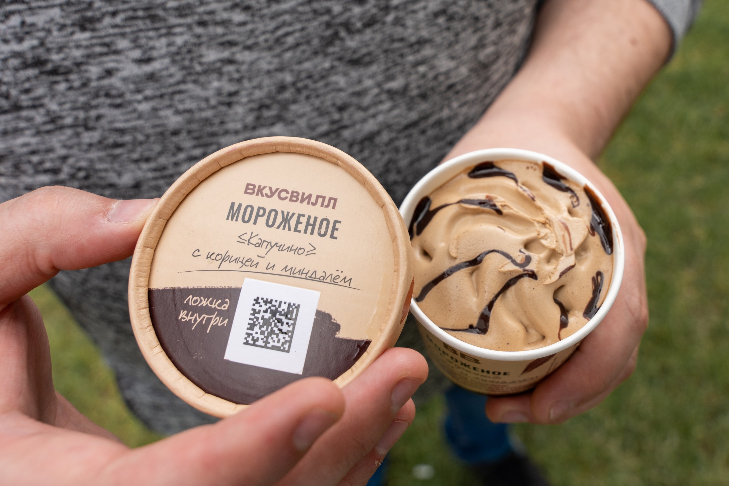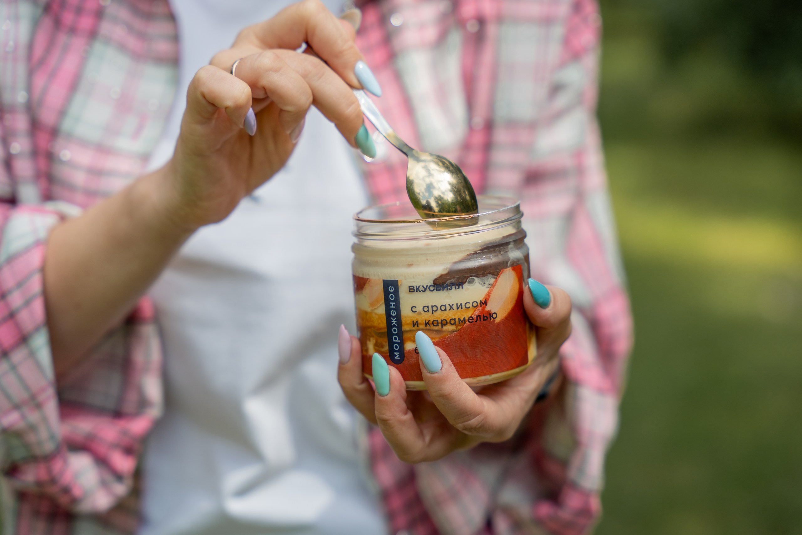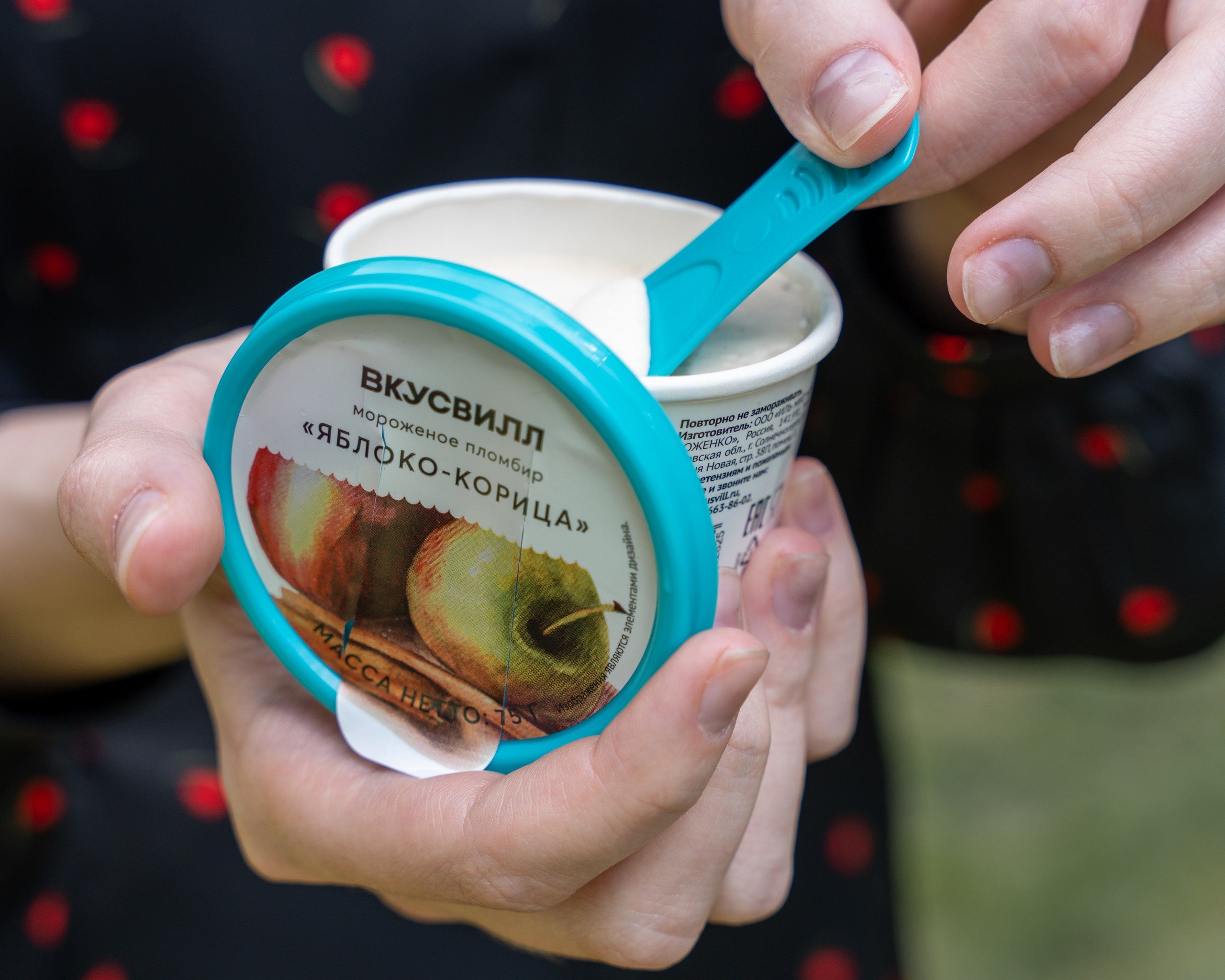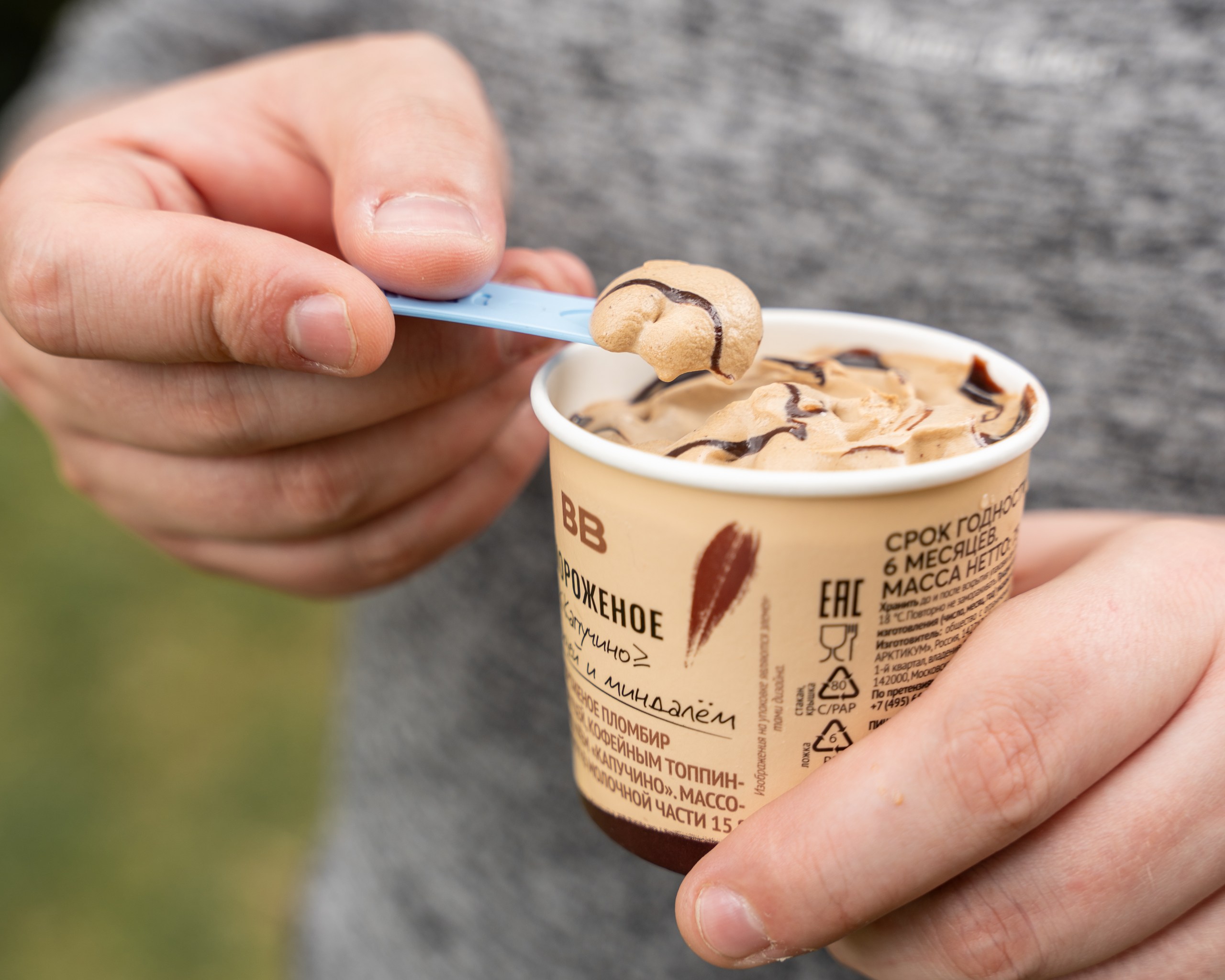 «Густой ванильный пломбир с кисло-сладким малиновым джемом и хрустящими орешками кешью — это сочетание просто великолепно! Нежное и освежающее, оно понравилось всем в нашей семье. Ложечка под крышкой — очень удобно для прогулок».
