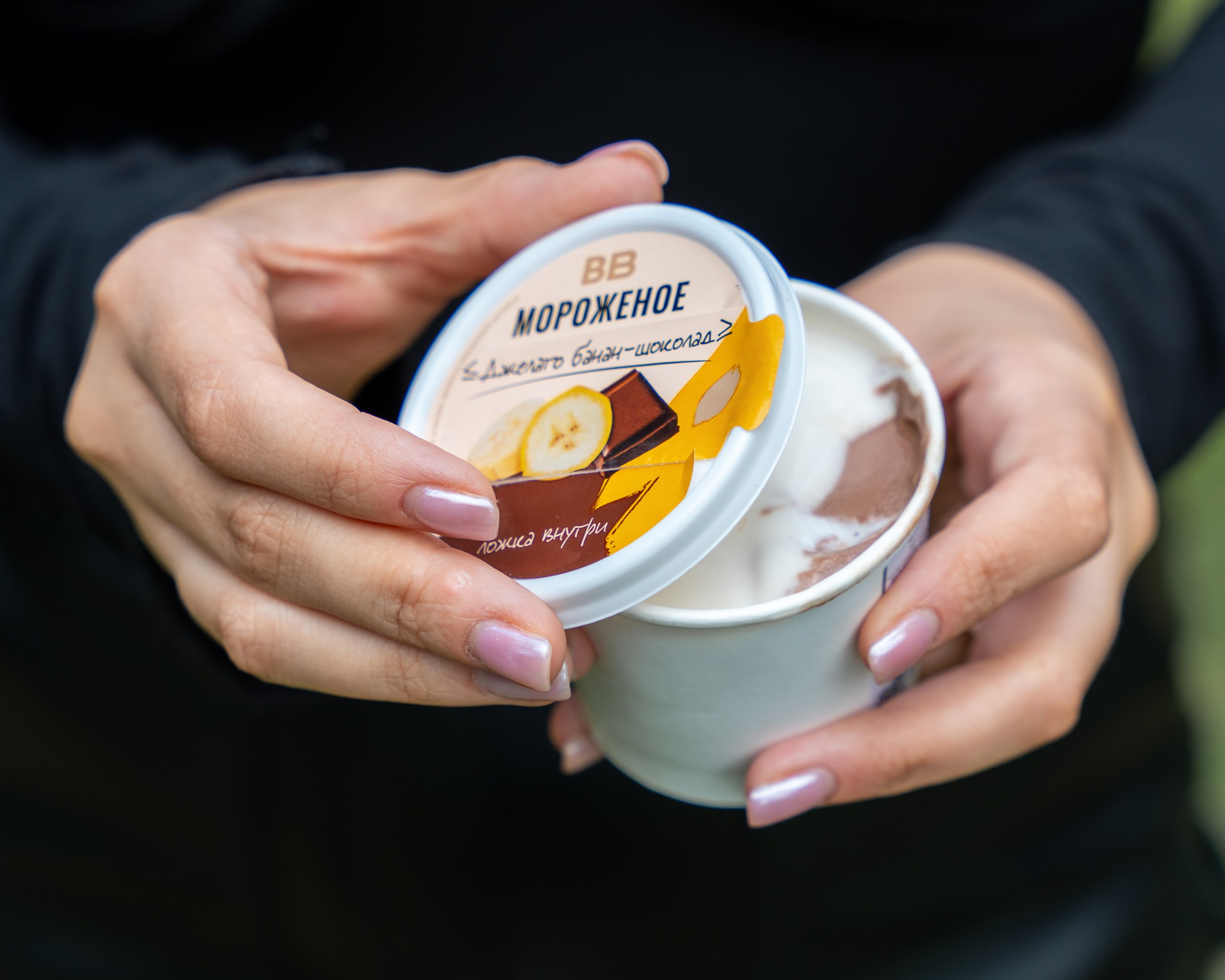 «Необыкновенное двухслойное мороженое с текстурой карамельных ирисок. Одна половинка — банановое джелато, другая — шоколадное. Вкус просто невероятный, а компактная ложечка в крышке делает его удобным для наслаждения на ходу».