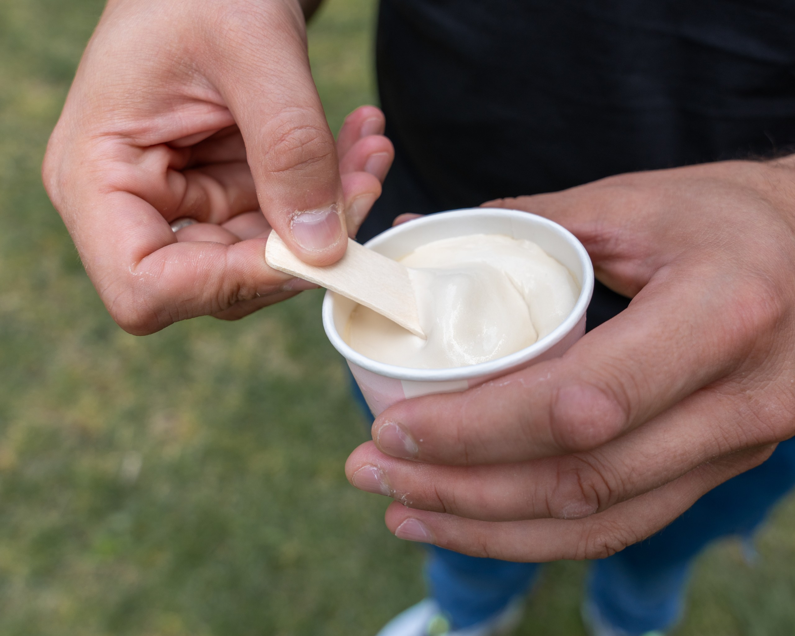 «Свежесть йогурта и сливочность классического пломбира в этом мороженом просто бесподобны. Тонкие кисломолочные нотки идеально сбалансированы шелковистой сладостью цветочного мёда и гурманскими нотами миндаля. Большая упаковка позволяет наслаждаться этим лакомством вместе с близкими — действительно, десерт для всей семьи».