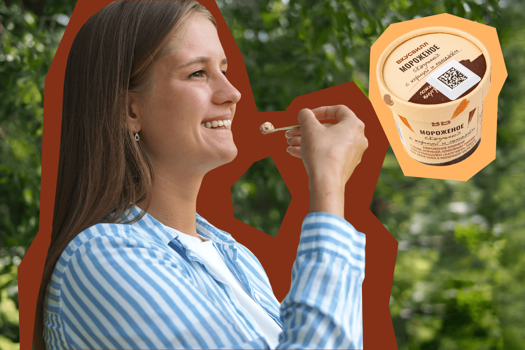 “Классический нежный пломбир со сливочно-ванильным вкусом. А выглядит прямо как в детстве! Удобная упаковка – не страшно уронить, не капает, порция небольшая. То, что нужно для ребёнка”, – говорит Алина Алмакаева.