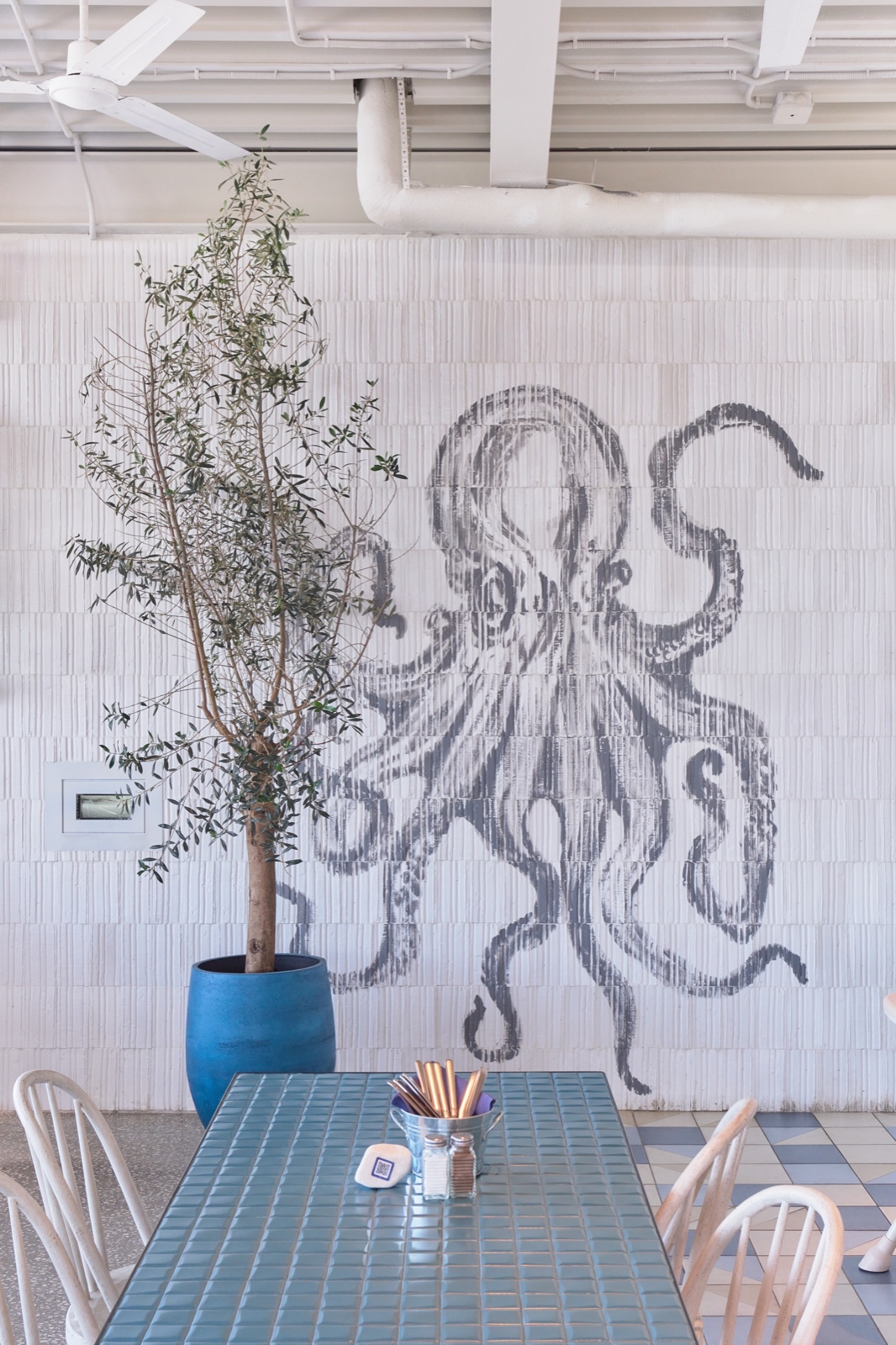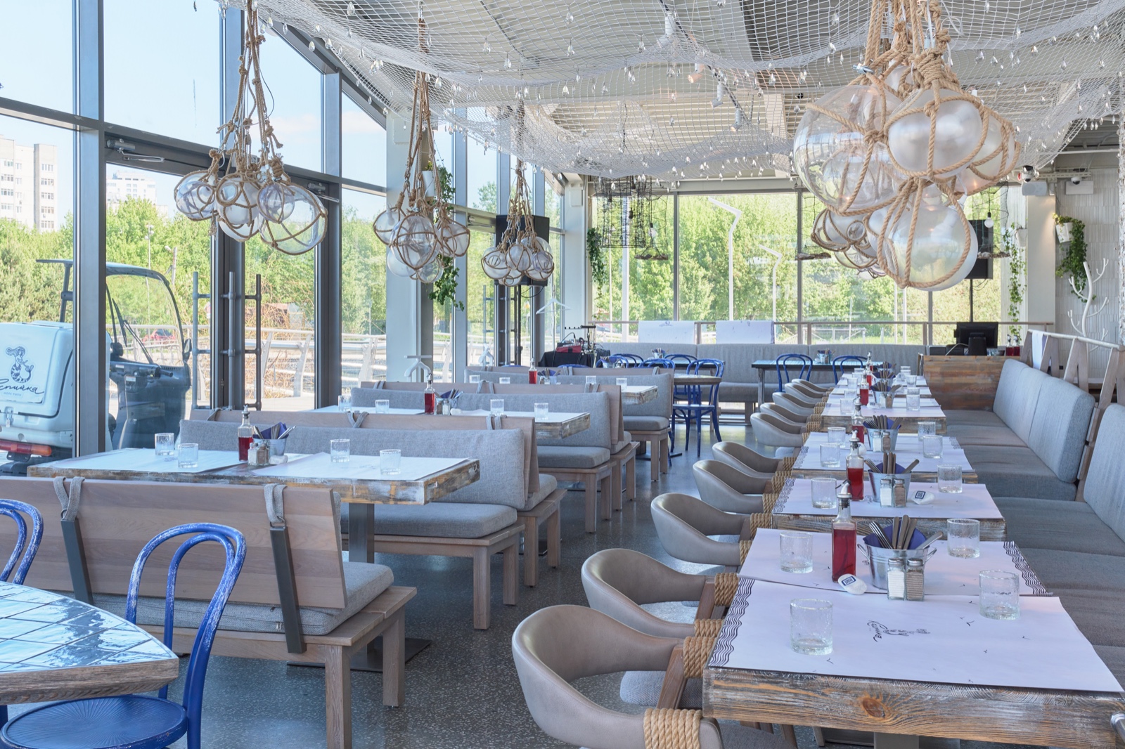 В глубине зала цепляешься взглядом за стену, где проступает чёрно-белый силуэт осьминога. Над головой — рыбацкие сети, в которых запутался мягкий свет, а подвесные светильники похожи на стеклянные шары, что моряки используют для ловли рыбы.