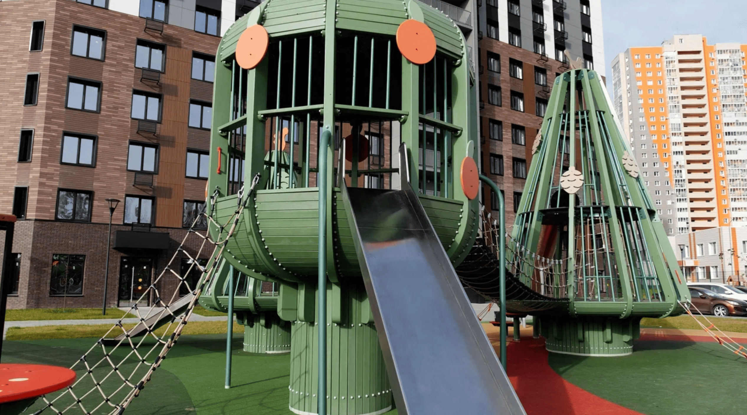 Пространство вокруг дома поддерживает ту же логику. Двор спроектирован как место для отдыха и движения, без пересечений потоков. Детские площадки выполнены в сказочном стиле, где каждая деталь стимулирует фантазию и игру. Спортивные зоны расположены отдельно, чтобы взрослые могли заниматься спокойно, не мешая детям.