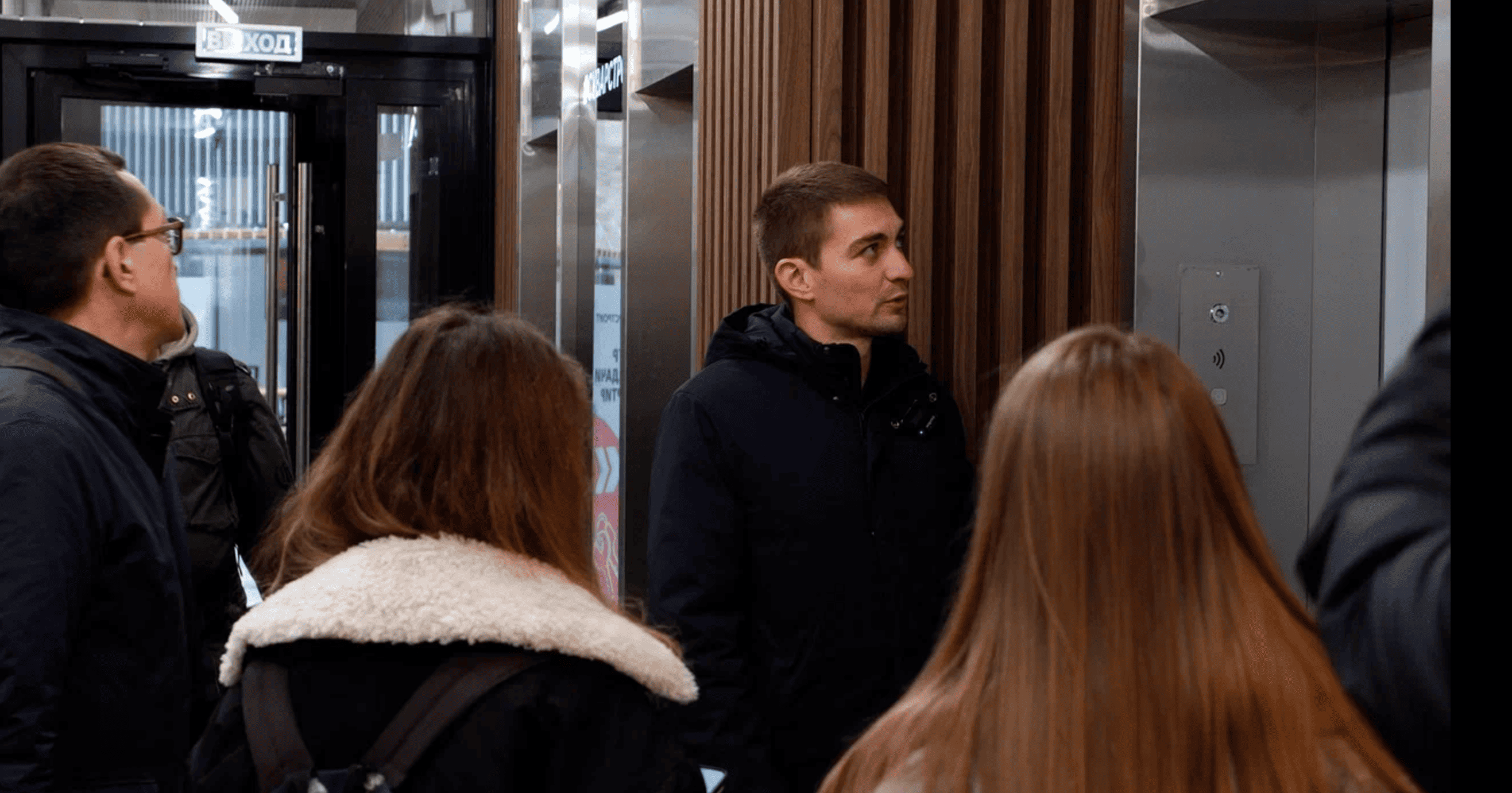 Входные группы сделаны как продолжение двора. Сначала тёплый тамбур, который не пропускает холод дальше в холл. На первом уровне керамогранит выдерживает грязь и снег, установлена система очистки обуви, домофон. Потолки Грильято скрывают инженерные коммуникации и держат аккуратный ритм света. Лифтовые холлы обшиты деревом, поэтому звук мягче, а пространство ощущается теплее. Есть зеркала в полный рост.