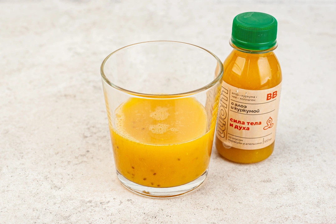 Напиток-шот с алоэ и куркумой – это небольшая бутылочка, наполненная полезными витаминами! В его состав входит нежное пюре из спелой маракуйи, освежающий апельсиновый сок и приятное послевкусие грейпфрута. Этот напиток – идеальное решение для укрепления иммунитета и получения энергии на весь день.