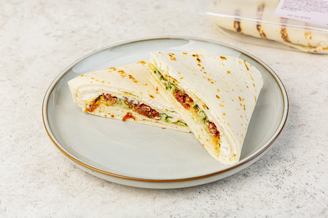 Тортилья с сыром и вялеными томатами - еще один вариант для закуски к напиткам. Тортилья, щедро смазанная творожным сыром, моцарелла, соус песто и вяленые томаты придают мексиканской лепешке нотки итальянского колорита. Даже звучит романтично, а на вкус - просто песня!