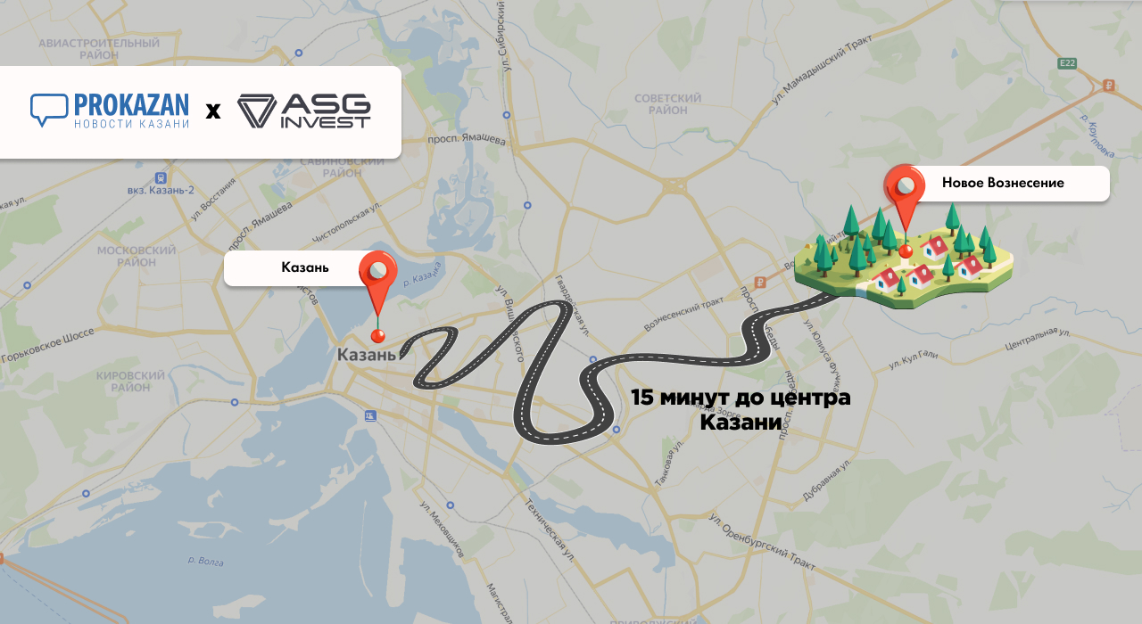 Новое Вознесение расположено в Советском районе Казани, рядом с Ноксинским лесом. Уже сейчас участки обеспечены электричеством и асфальтированными дорогами, а в будущем поселок станет частью крупной магистрали «Вознесенский тракт», которая свяжет центр Казани с федеральной трассой М7. Это открывает огромный потенциал для роста стоимости участков. Стоимость участков начинается от 1 100 000 рублей за сотку.
