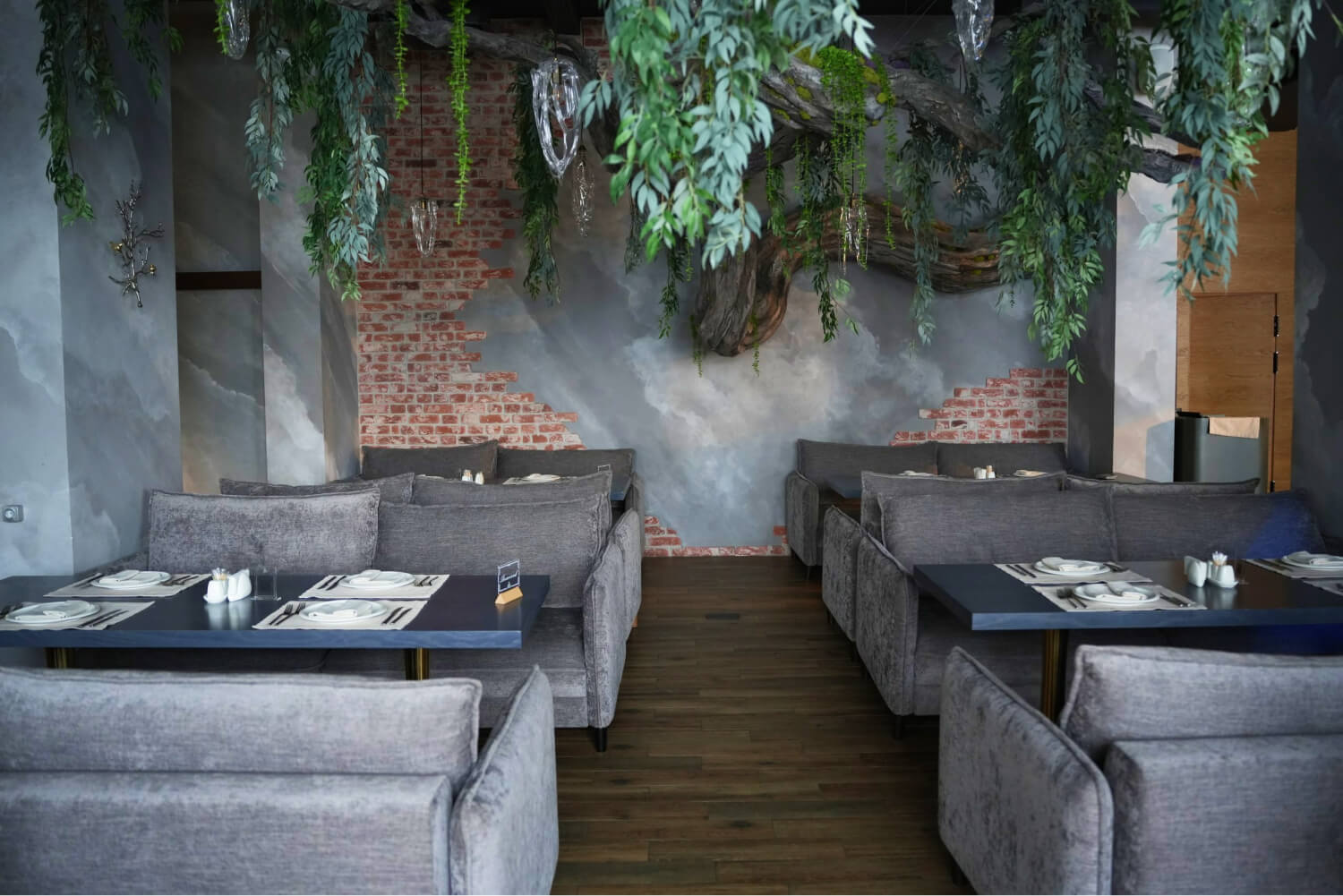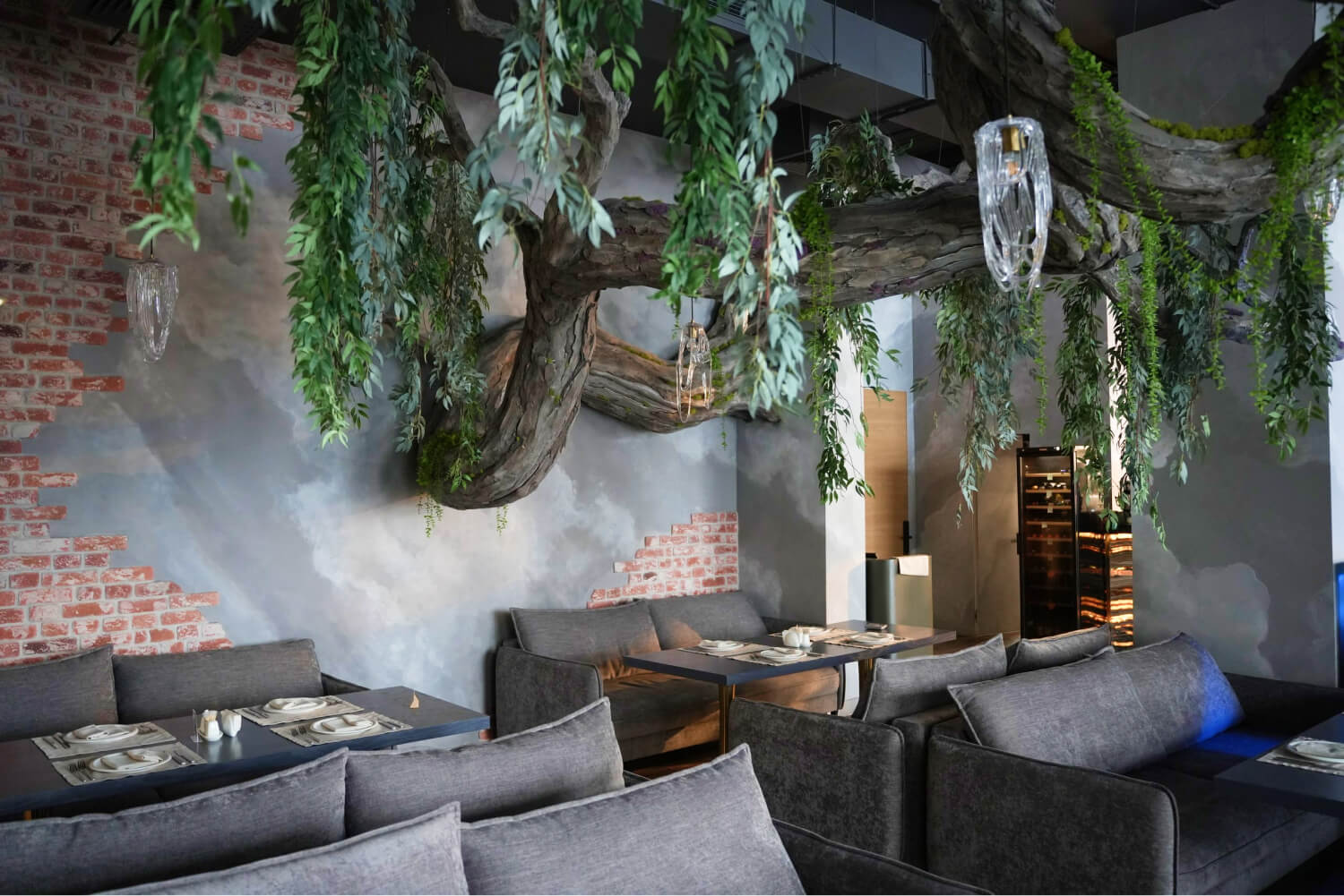 Основной зал – это пространство, где с потолка свисает ива, создавая ощущение, что каждый гость находится в гуще ветвей. Здесь проводятся вечера живой музыки по пятницам и субботам.
