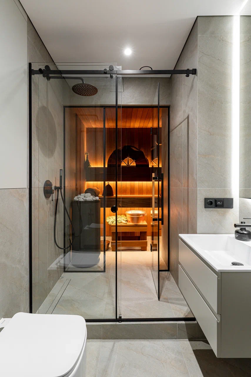 Во «Временах года» есть и необычные решения. Среди предложений — квартира с собственной террасой и баней, где установлена электрическая печь с режимами русской бани и финской сауны.