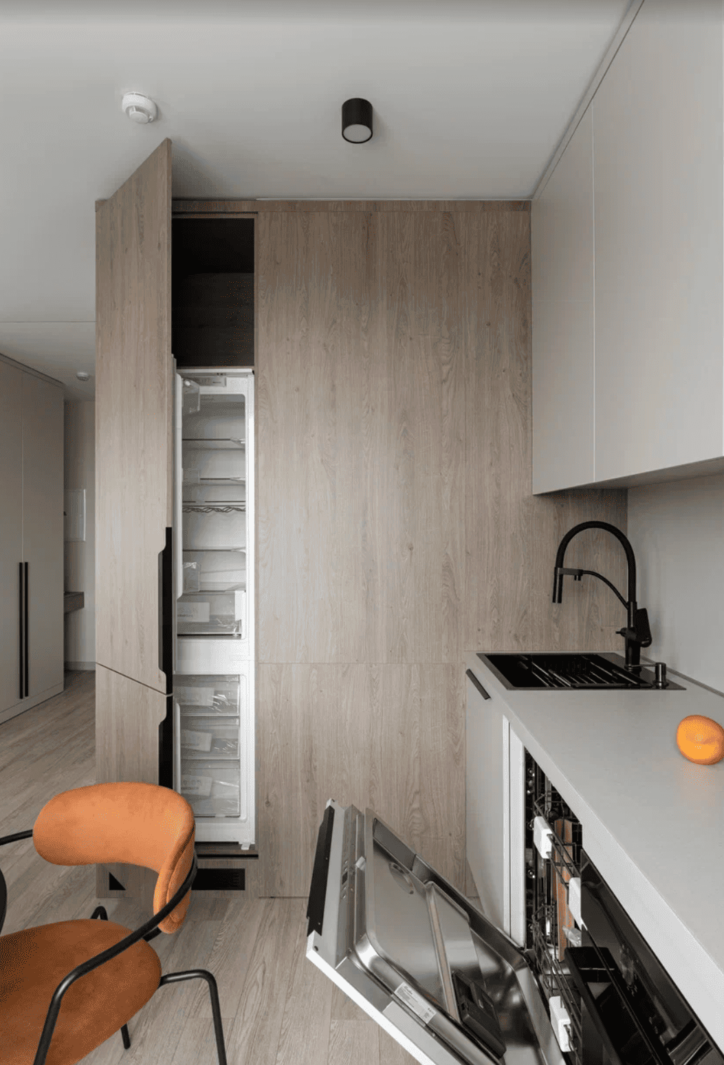 «Денвер Трюфель», напротив, построен на более глубоких серых тонах и древесных фактурах. Такое сочетание придает интерьеру выразительность, создает более камерную атмосферу и подчеркивает архитектуру пространства.