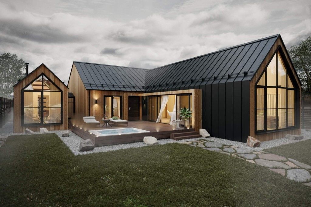 - Трендовые дома в стиле барнхаус или дом-сарай. Данный стиль в последнее время набирает популярность. Именно каркасный дом возводится при соблюдении барнхауса. Кроме стен, другой особенностью такого дома является кровля: здесь она фальцевая. Далеко не каждая бригада рабочих может правильно ее смонтировать.