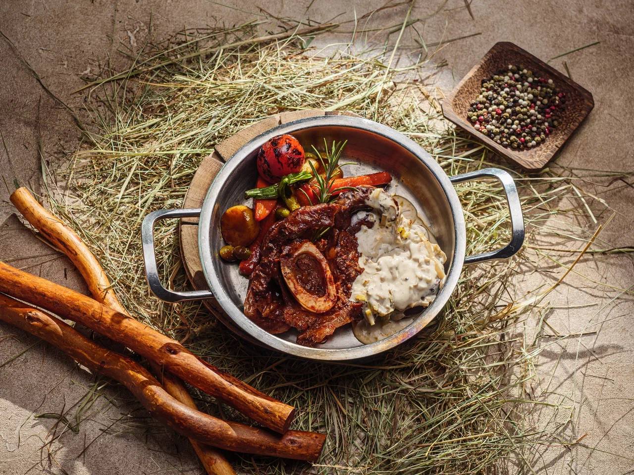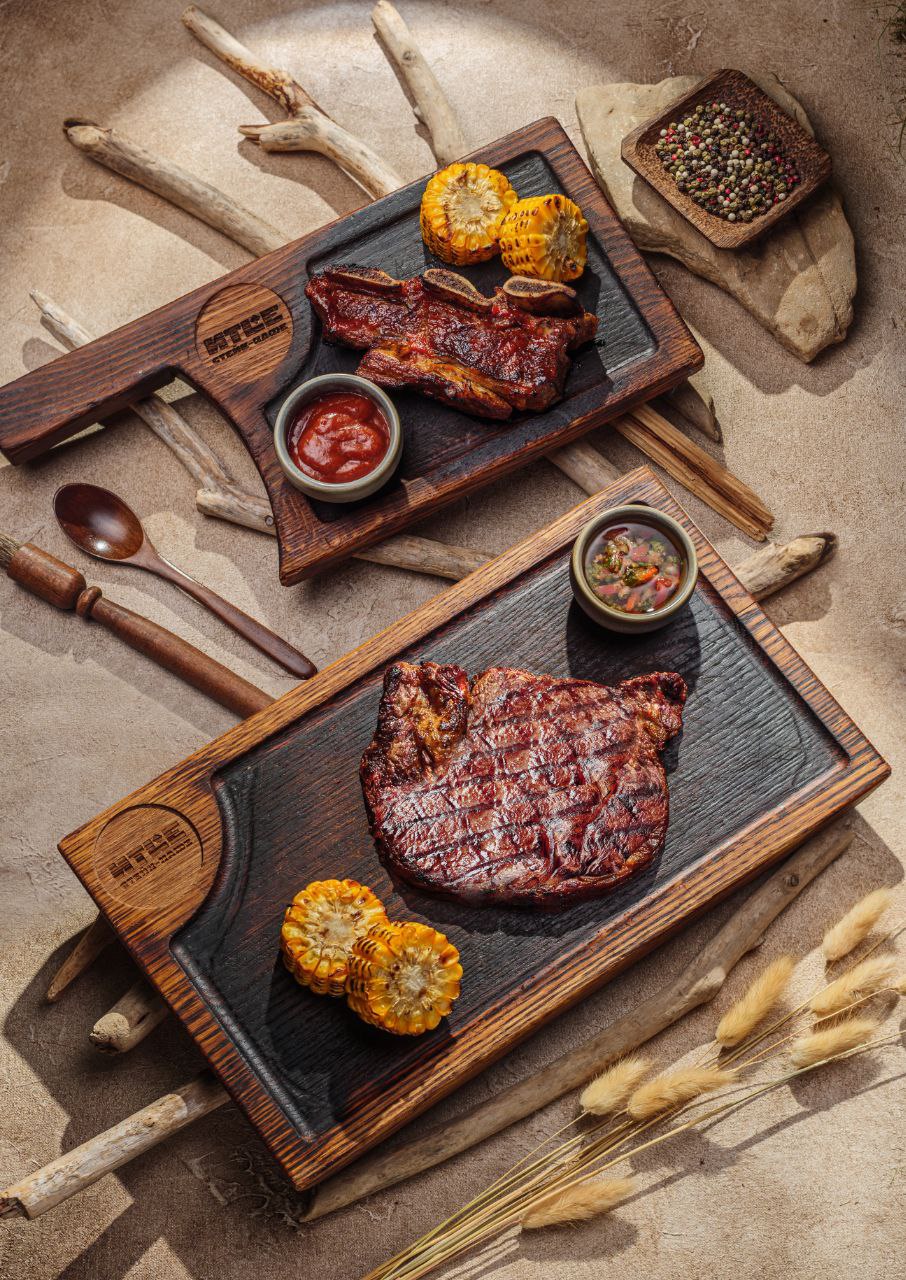 Говяжьи рёбра, томлёные для сохранения сочности, обжариваются на гриле и подаются с фирменным имбирным соусом барбекю. Гарнир из кукурузы подчёркивает сладкие и дымные нотки блюда. А стейк Рибай, приготовленный из мраморной говядины спинного отруба, впечатляет насыщенным вкусом и мясистостью. Обжарка на угольном гриле придаёт ему неповторимый аромат и текстуру, а подача с кукурузой и чимичурри завершает гастрономическую композицию.
