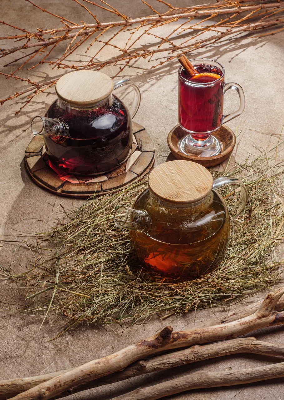 Чай Пуэр «Клубника-гранат» сочетает землистый вкус с фруктовыми нотами, а «Мандарин-хризантема» радует цитрусовой кислотностью и цветочным послевкусием. Глинтвейн с вишнёй, гранатом и специями согревает и создаёт уют в зимние дни.