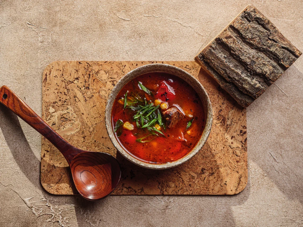 Если вы ищете сытное и согревающее блюдо, мясная похлебка станет вашим идеальным выбором. Густой бульон на говядине соединяет насыщенные овощные и мясные нотки. Зеленый лук, подаваемый к супу, добавляет свежести и легкости, создавая баланс.
