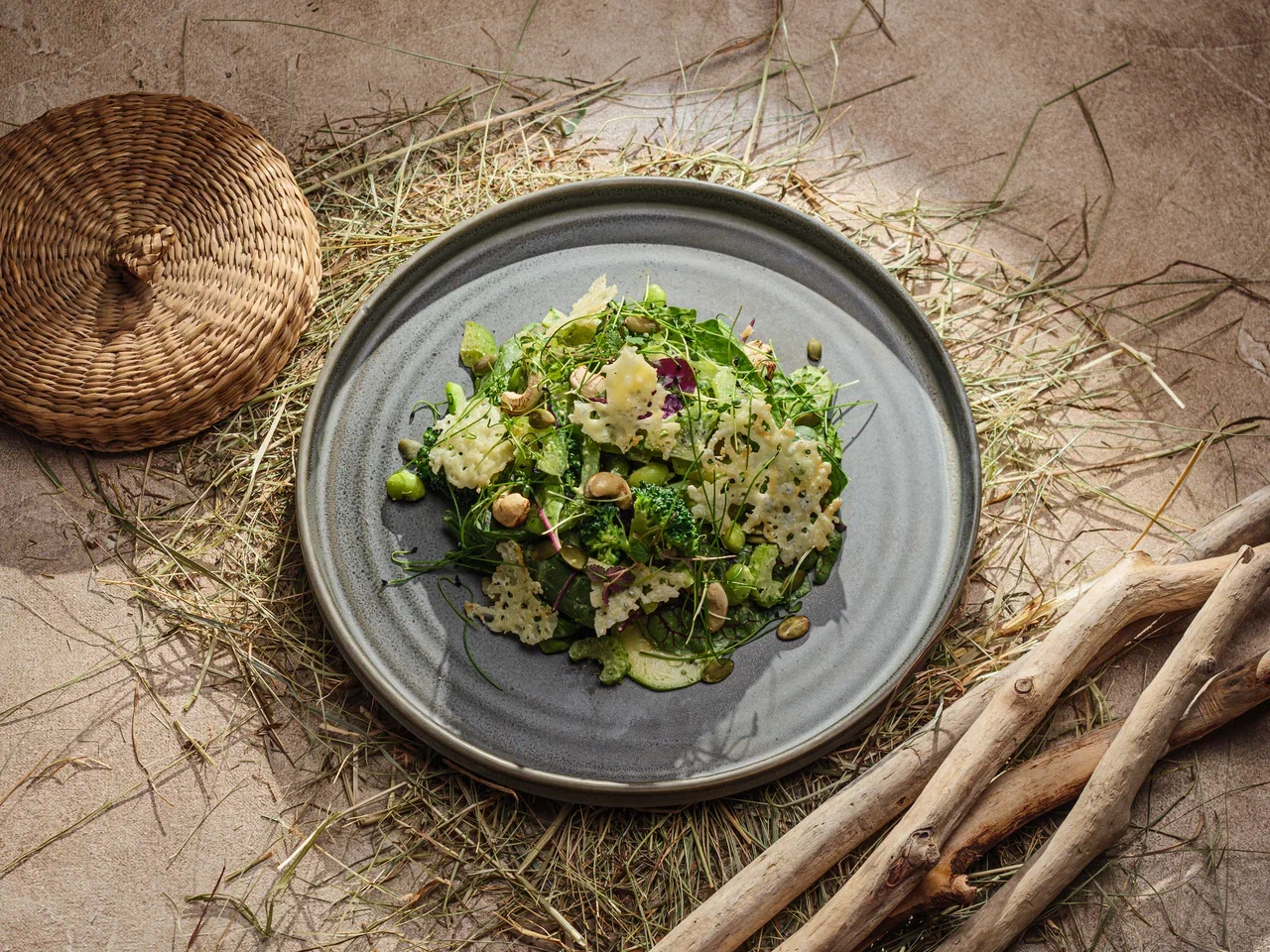 Для тех, кто ценит свежесть и здоровье, ИTLE предлагает салат, где сочетается богатство зелени. Сочетание шпината, сельдерея, брокколи и кабачков, дополненное эдамаме и кусочками киви. Завершают блюдо чипсы из пармезана и соус из копчёной рикотты, придающие ему насыщенность и изысканность.