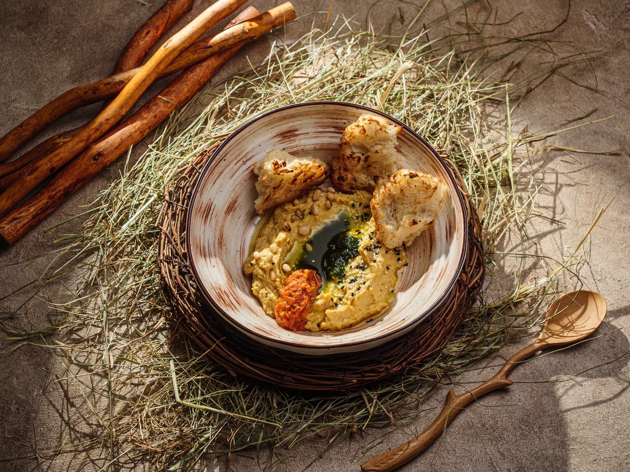 Мягкий хумус в ИТLE — произведение искусства. Нут, тахини, оливковое масло и сок лимона создают нежную основу, а зира, кунжут и свежая кинза добавляют восточный акцент. Блюдо идеально подходит как для закуски, так и для начала трапезы.