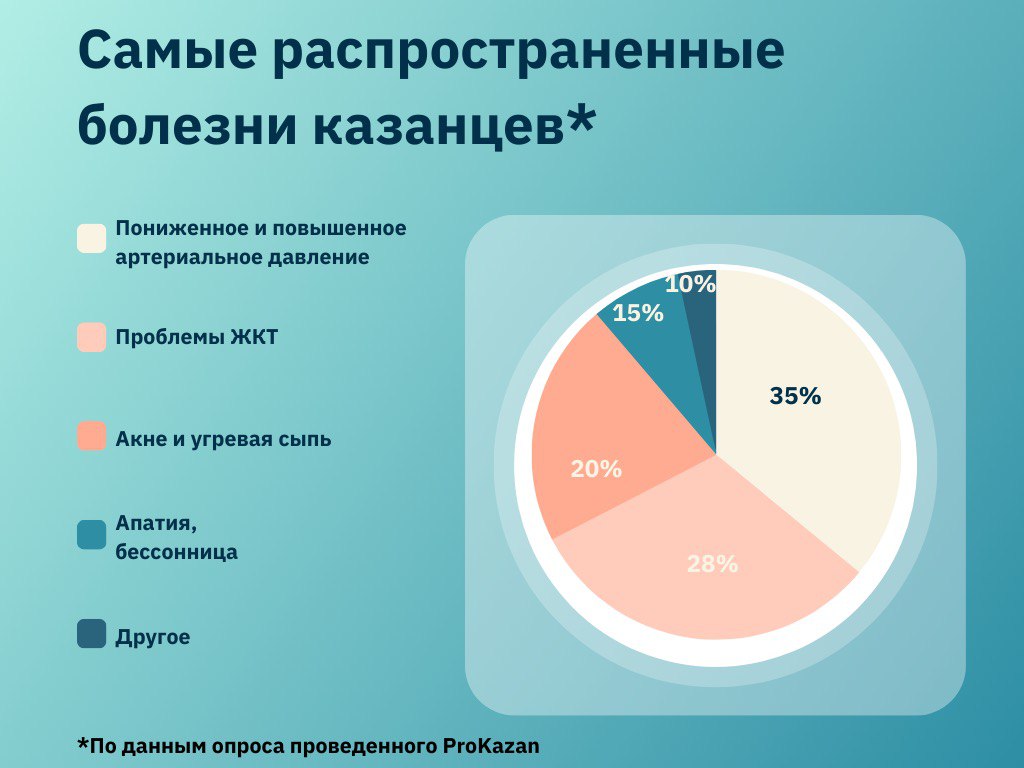 По данным опроса, проведенного ProKazan, были выявлены наиболее распространенные заболевания среди жителей Казани. Оказалось, что самым популярным недугом стало пониженное и повышенное давление, а также сердечно-сосудистые заболевания.