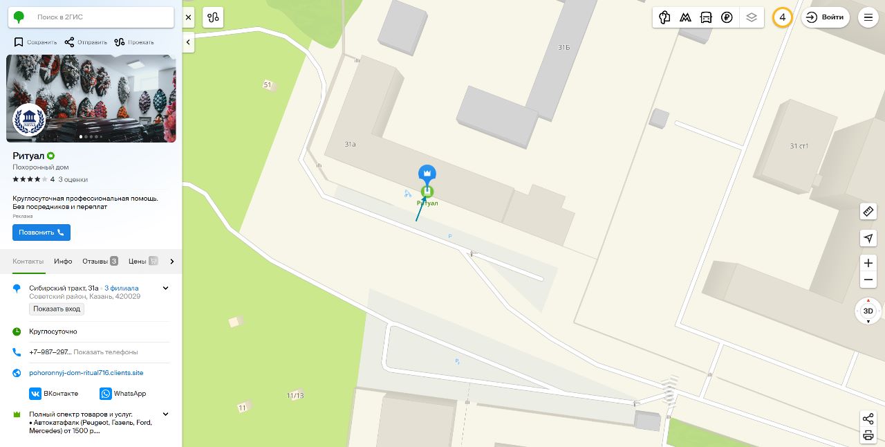 Дальше интереснее. Один из спикеров упомянул, что считает неправильным расположение ритуальных организаций непосредственно возле или даже внутри зданий моргов. По данным 2Gis, один из казанских филиалов похоронного дома «Ритуал» расположен по адресу: Сибирский тракт, 31а. На платформе также высвечивается реклама данной организации.