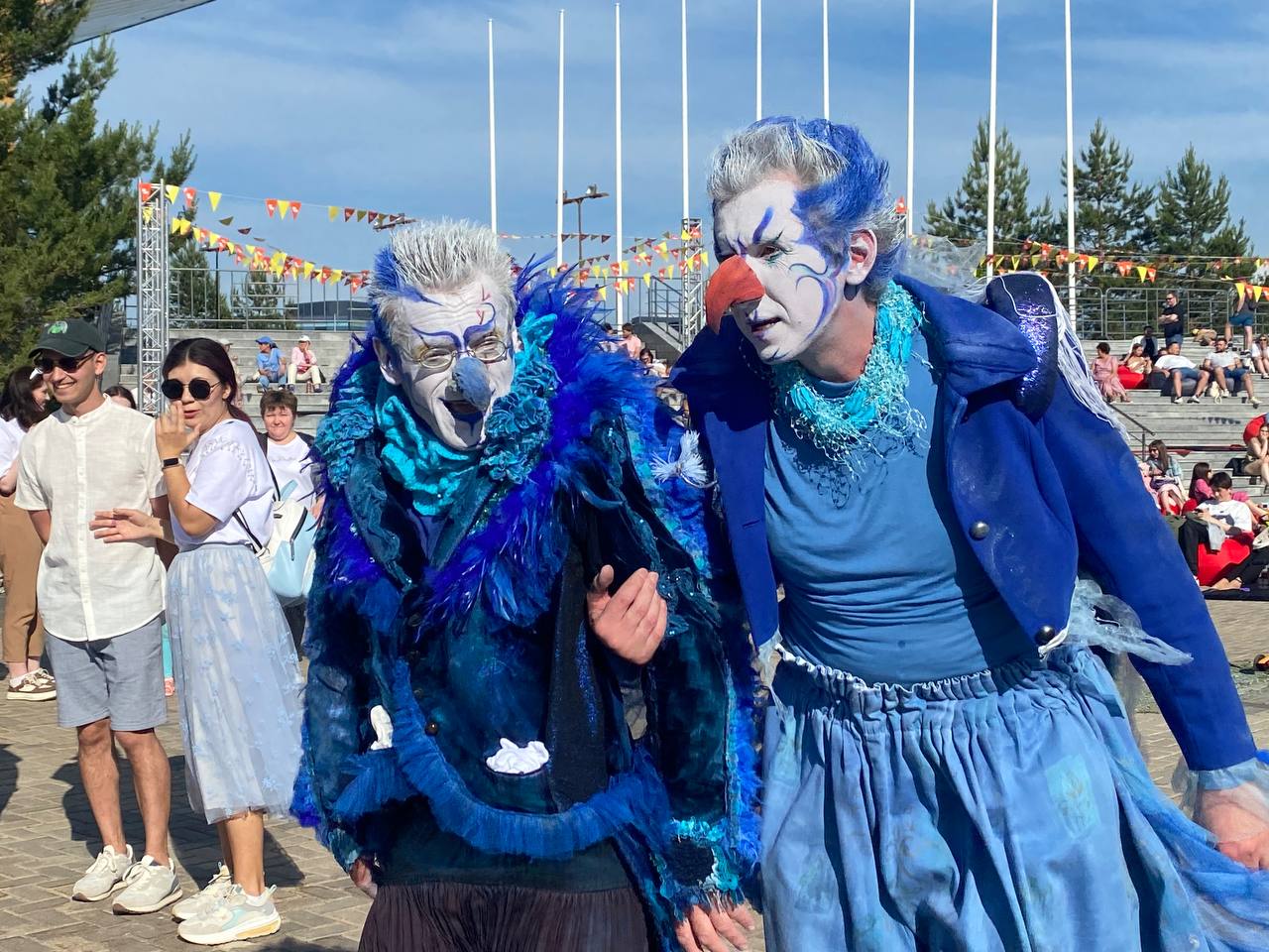 День рождения города начался с детского спектакля от Санкт-Петербуржского театра «Небесная карусель» — актёры с длинными накладными носами и в причудливых синих костюмах с перьями показали детям пластический спектакль о мире снов.