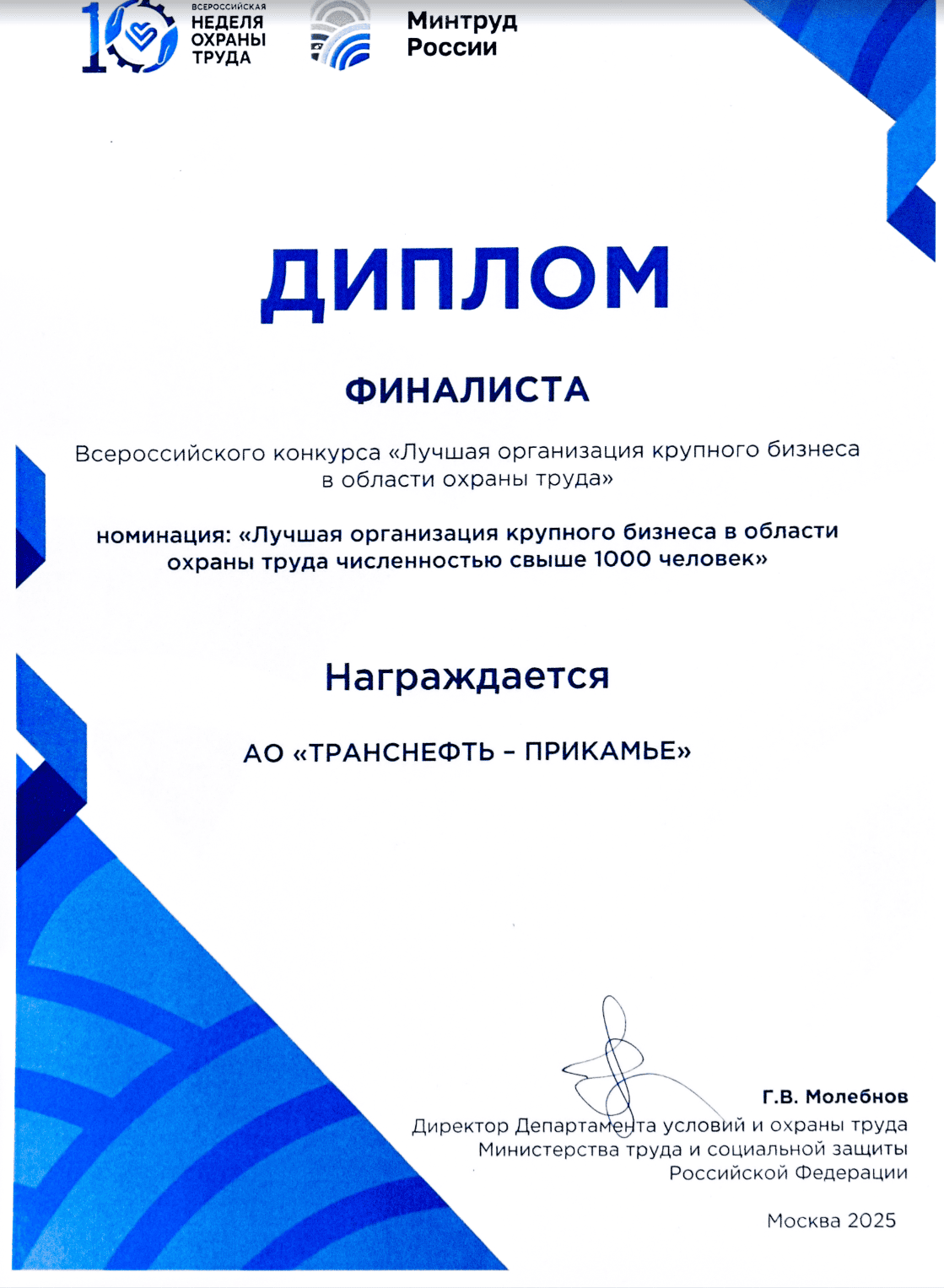 АО «Транснефть – Прикамье» (дочернее предприятие ПАО «Транснефть») отмечено дипломом финалиста Всероссийского конкурса в области охраны труда-2025 в номинации «Лучшая организация крупного бизнеса в области охраны труда численностью свыше 1000 человек».