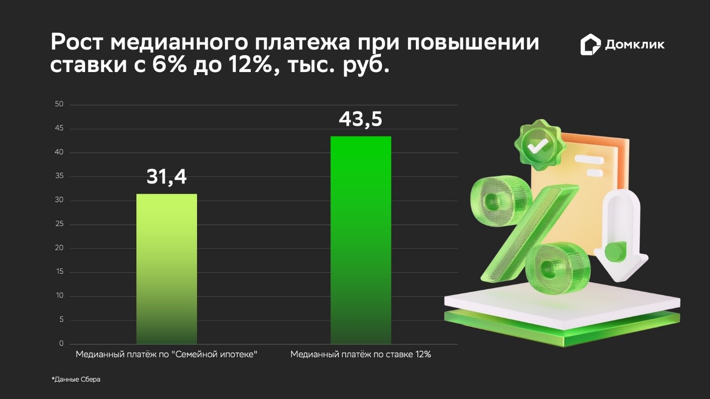 В 2025 году медианный ежемесячный платёж заёмщиков по «Семейной ипотеке» составляет 31,4 тыс. рублей. В случае введения новых условий для семей с одним ребенком платёж вырастет на 38% до 43,5 тыс. рублей в месяц.
