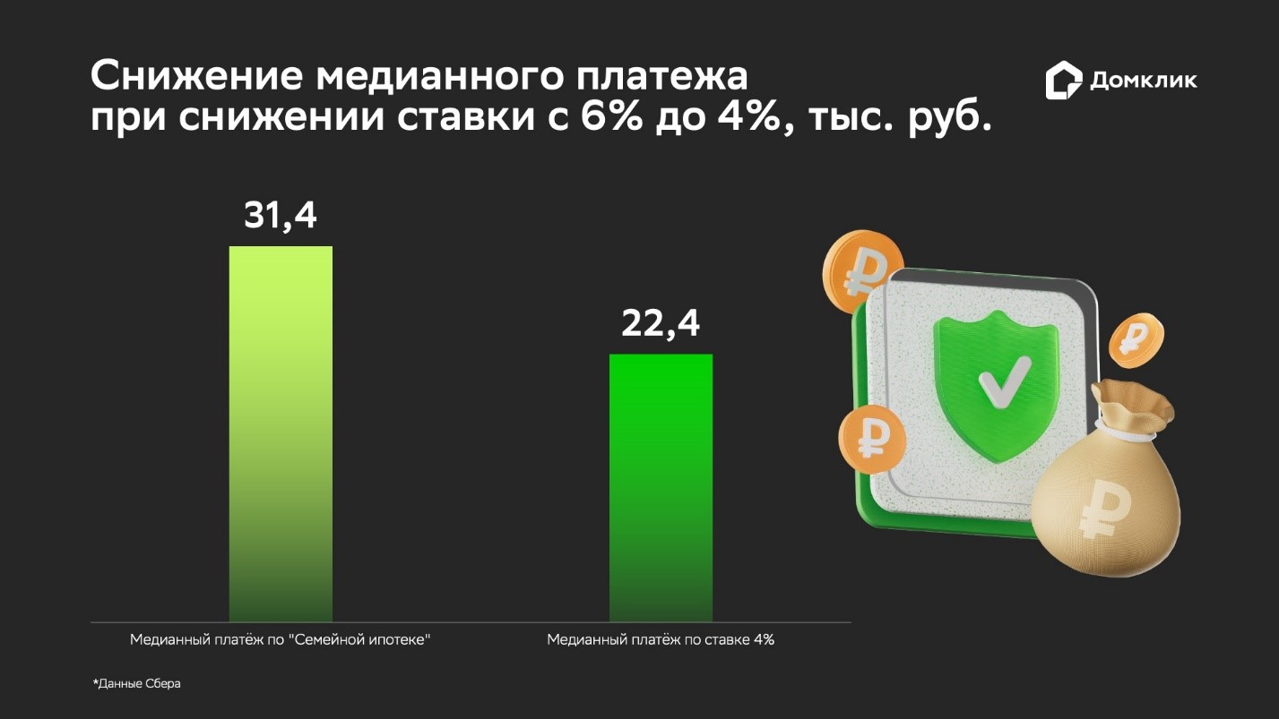 Для части заёмщиков планируется снижение льготной ставки по «Семейной ипотеке» - до 4% для семей с 3 и более детьми. В таком случае медианный платёж для заёмщиков опустится на 28,6% с 31,4 тыс. рублей до 22,4 тыс. рублей.