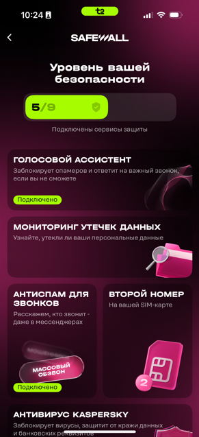 Платформа SafeWall построена по многоуровневому принципу. Базовый уровень доступен всем абонентам бесплатно и включен в любой тариф, при этом надежно защищает клиентов от киберугроз. Расширенные функции можно подключить по мере необходимости. Уже сейчас каждый пользователь Т2 получает комплексную базовую защиту от самых актуальных цифровых угроз без дополнительных настроек и платы.